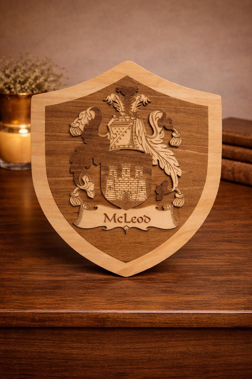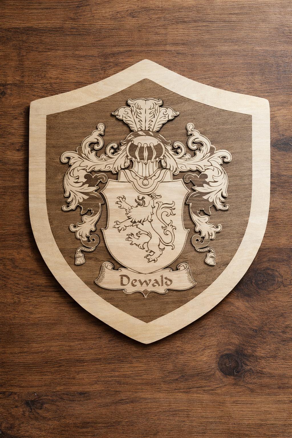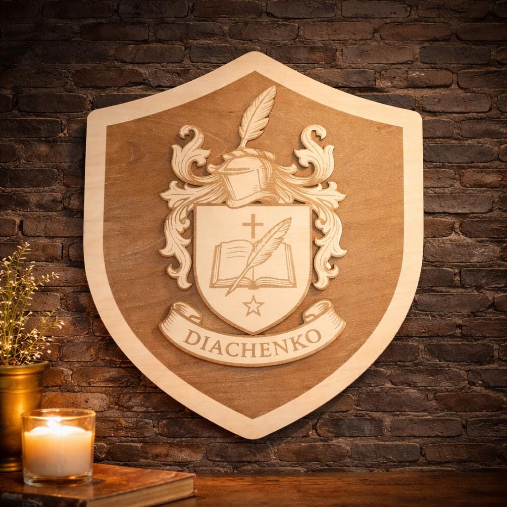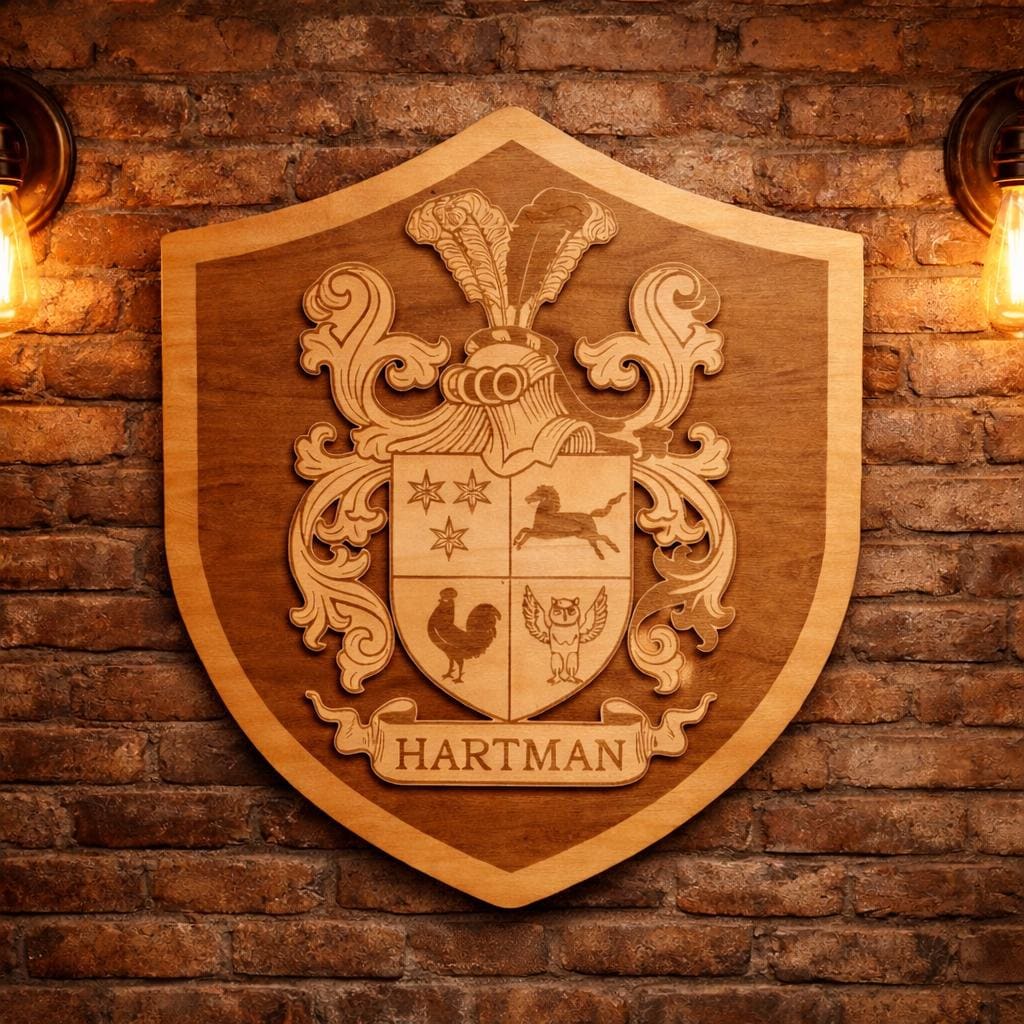 Each piece is a layered shield plaque, precision-engraved in basswood to highlight your ancestry, family identity, or brand. Designed as timeless heraldry wall art, these plaques make meaningful heirlooms for homes, offices, or thoughtful gifts.