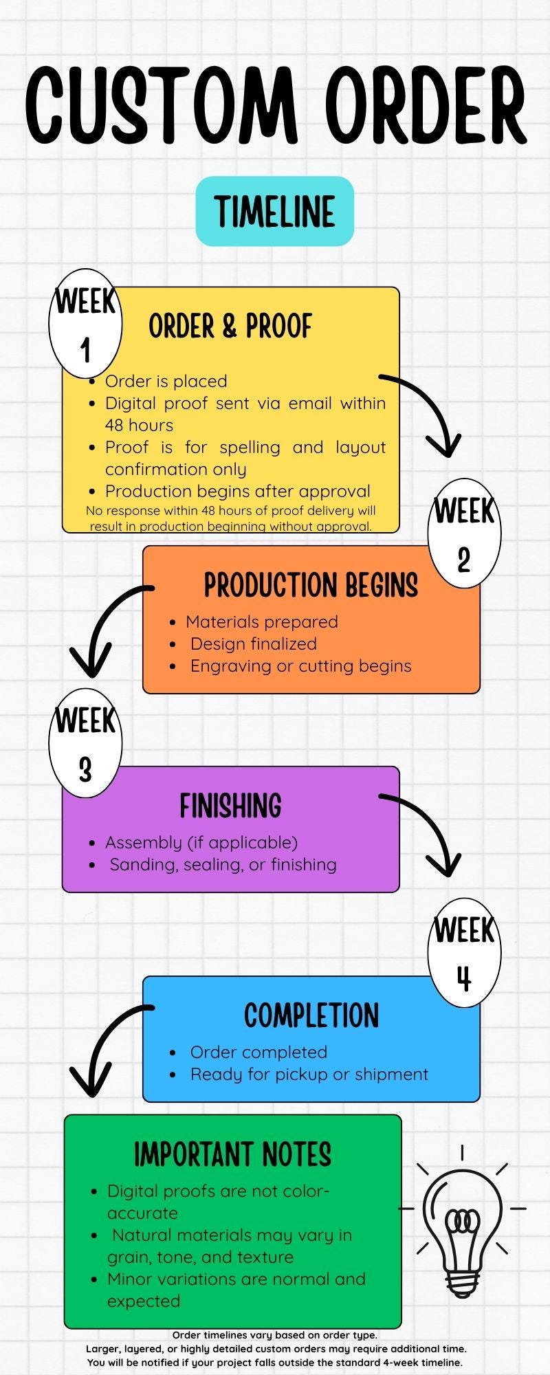 This is where it gets tricky! Our laser work area is 19x12". We do have the ability to make larger custom orders, to an extent. Message us and we'll discuss your specific request.