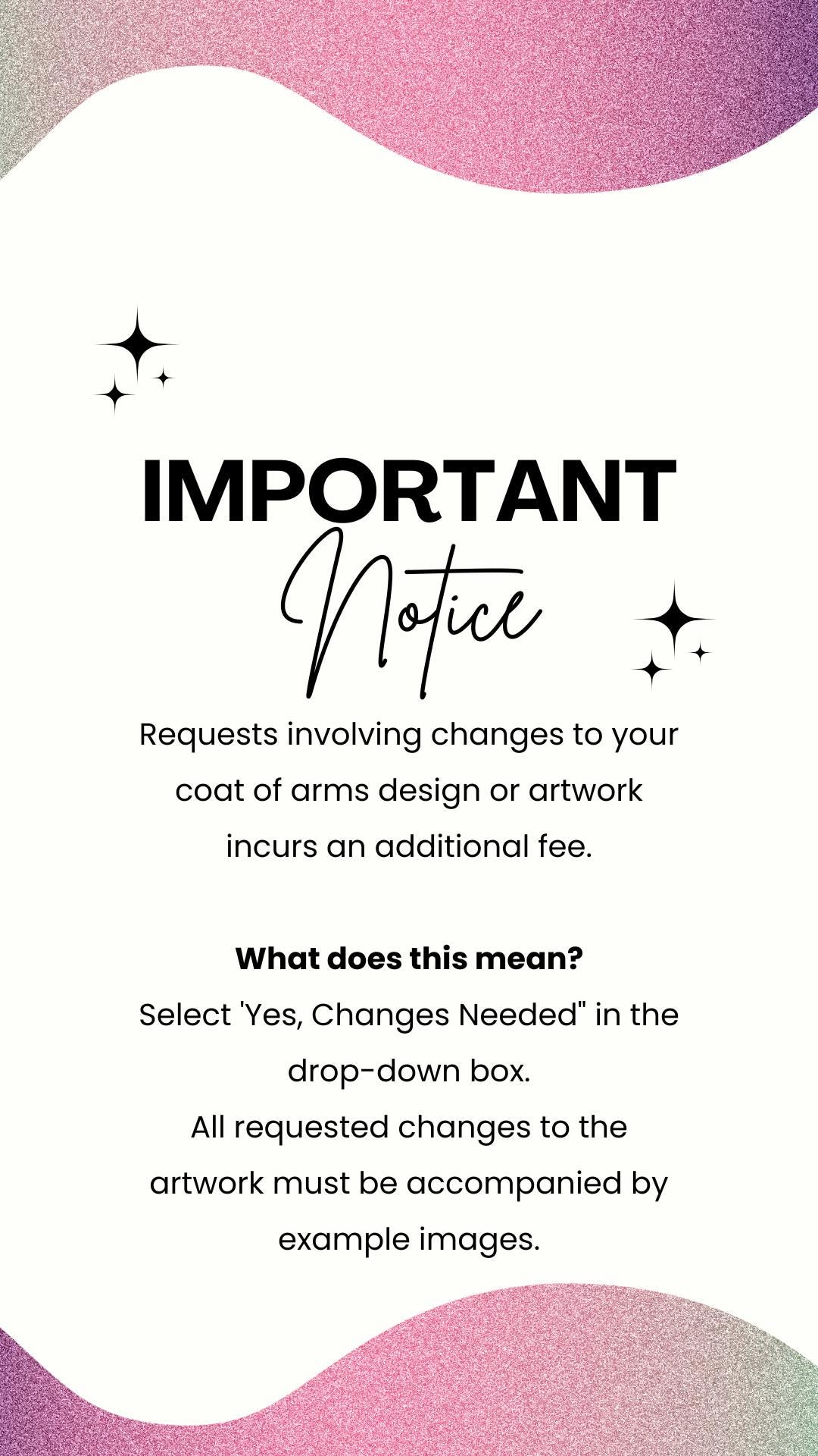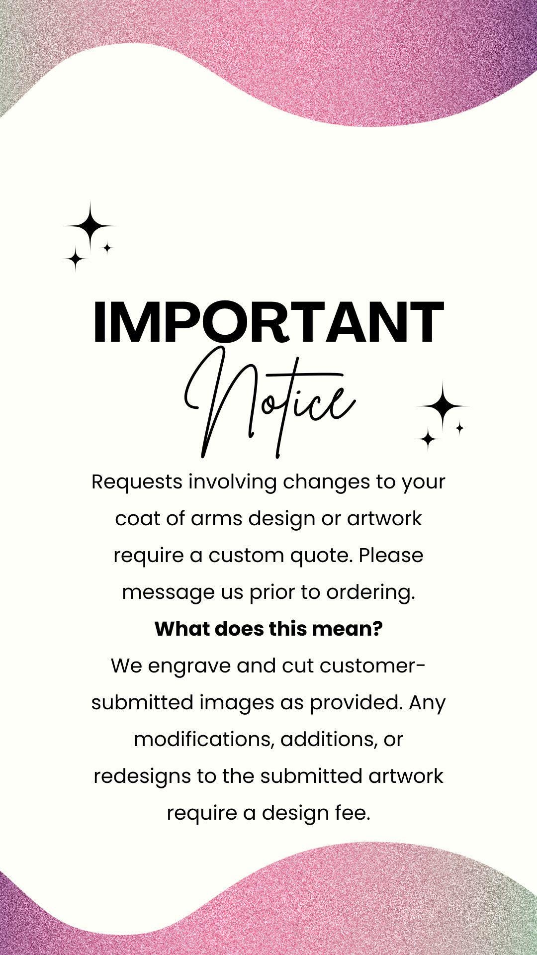 Personalization is included. Requests involving changes to the coat of arms artwork, layout, or structure are considered custom design work and require prior approval.